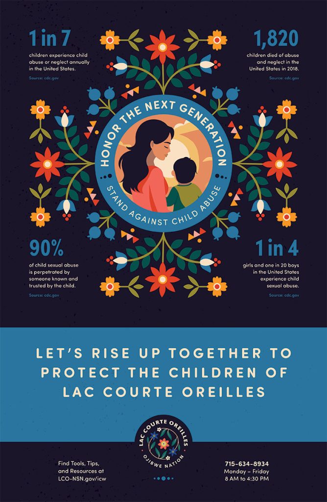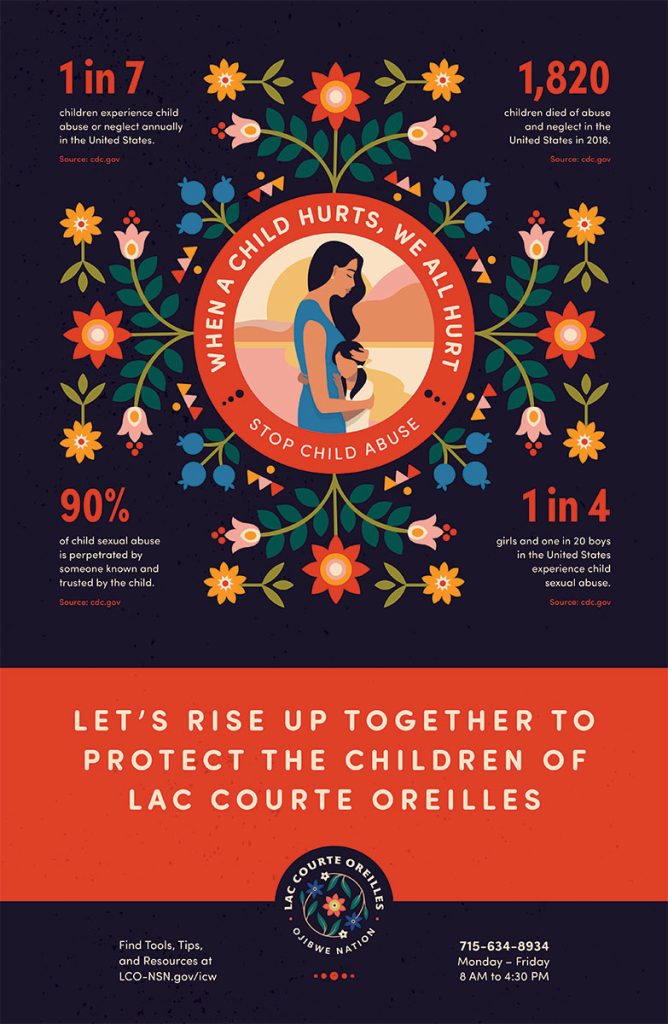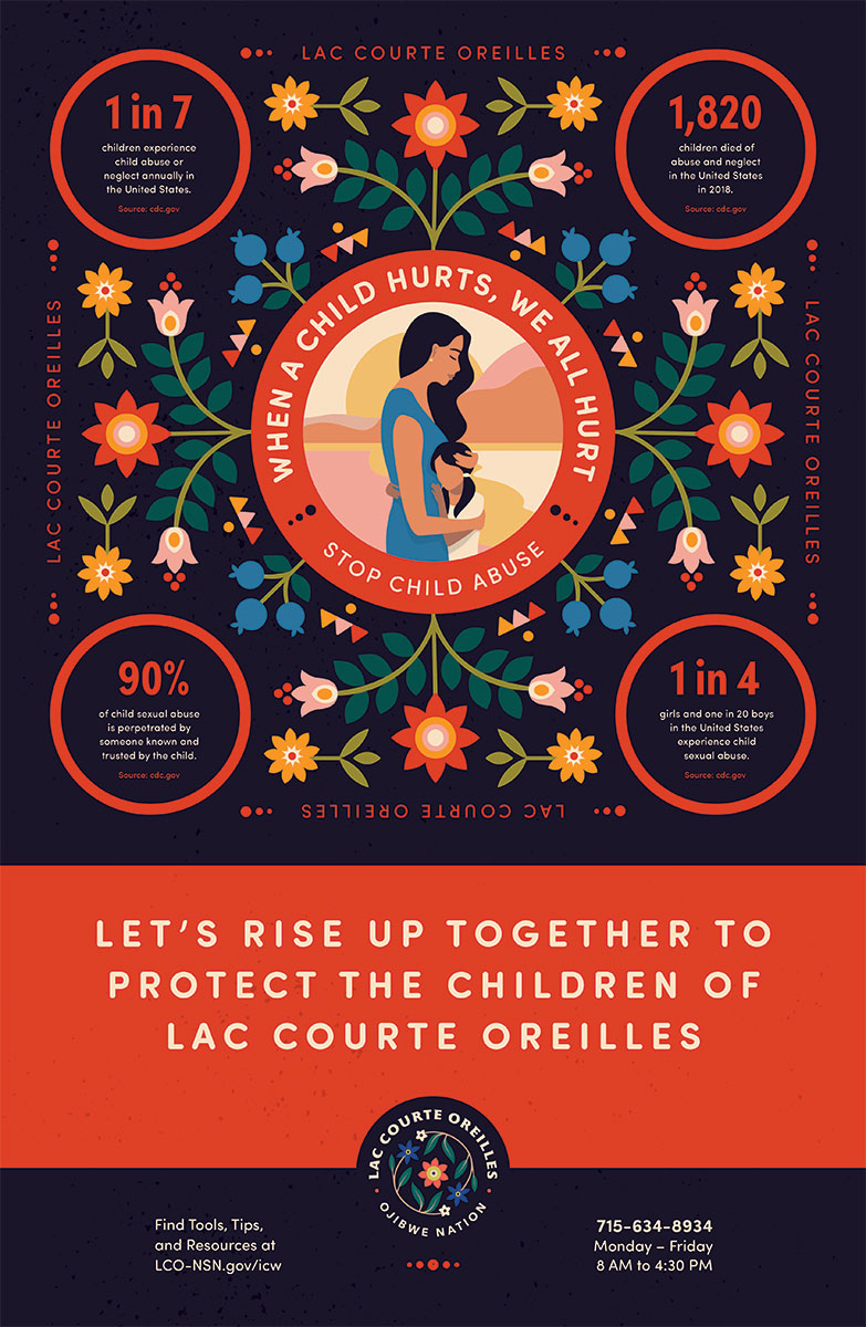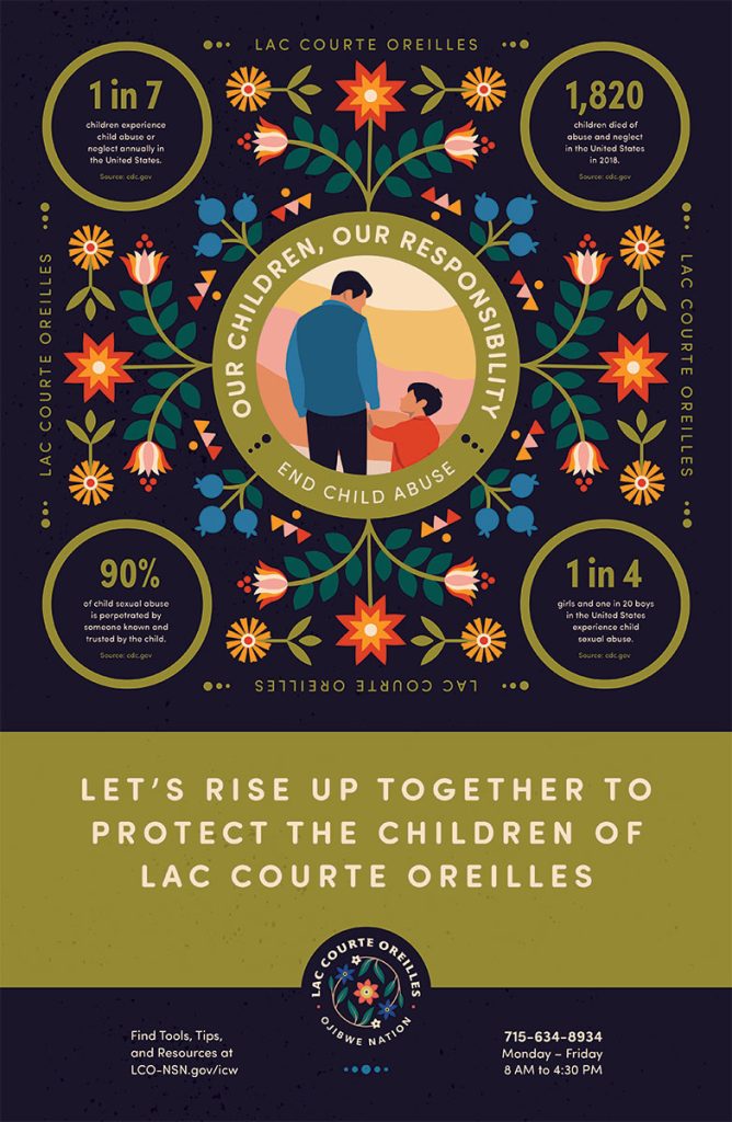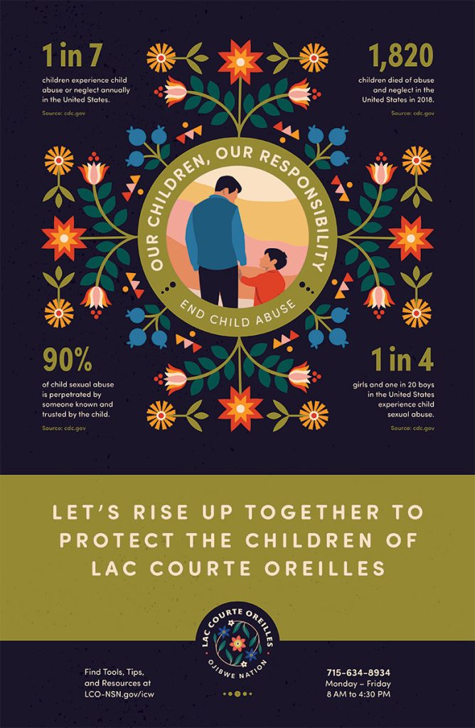 1. Download the Child Abuse Awareness for Lac Courte Oreilles Posters below and print them to post at your office, on community boards, or to email out to your network.